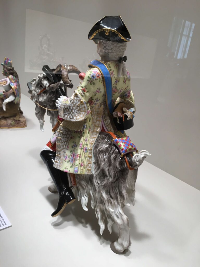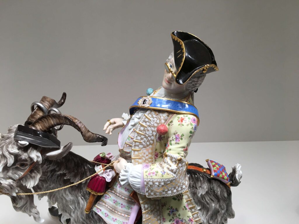 眼鏡をかけ、体の随所に裁縫道具を身につける山羊と男性。一節にブリュール伯爵のお抱え仕立屋がモデルとされ、ユーモラスで巧みなモデリング、細やかで美しい絵付けが目を惹くが、風刺的意味合いが強い。