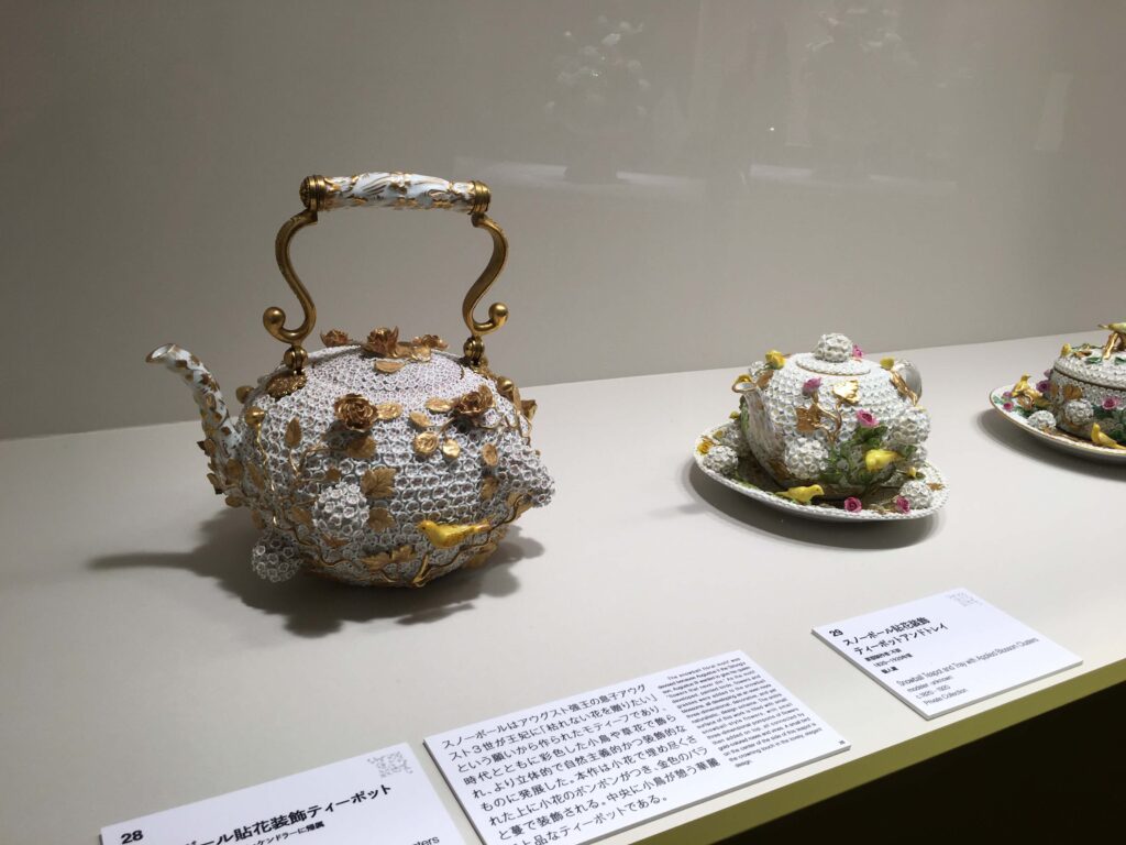 貼花装飾の「スノーボール」はマイセンを代表する加飾法のひとつである。マイセンでは18世紀前半にケンドラーが、コーヒーとティーのセルヴィスに用いたのが最初のスノーボールの加飾とされ、その後18世紀なかばに彩色した鳥のモティーフが加えられるようになった。白く丸い花の球体はとてもかわいらしく日本にも多くの愛好家が存在する。