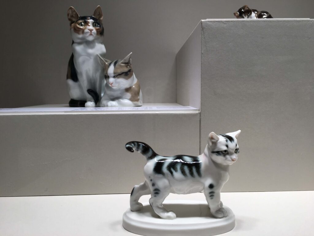 もちろん、マイセンでは猫も作られています。こちらも19世紀後半から作られているようで。猫のしなやかさや柔らかい毛の質感を表現するのにイングレイズの技法が使われているそうです。