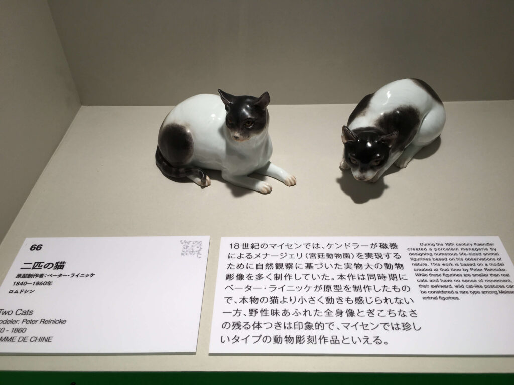 マイセンがつくる犬のうち4割以上は19世紀後半から20世紀前半にかけて製作されたものだそうです。展覧会では犬に関する展示品の撮影はNGでした。猫は写真撮影可能だったのに、なぜだろう(泣)。犬を飼ったことがある身としては、あの可愛さを写真に撮りたかったな、なんて贅沢なことも思ったり。