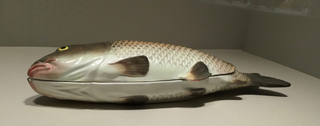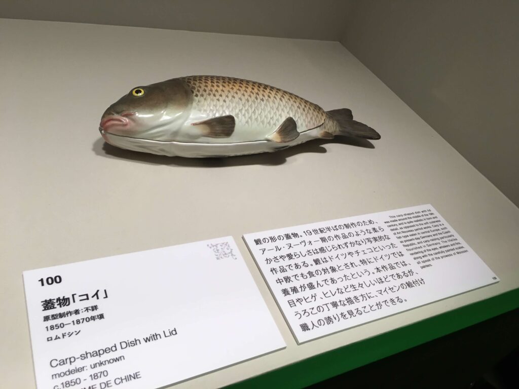 鯉の形の蓋物。19世紀半ばの制作のため、アール・ヌーヴォー期の作品のような柔らかさや愛らしさは感じられずかなり写実的な作品である。