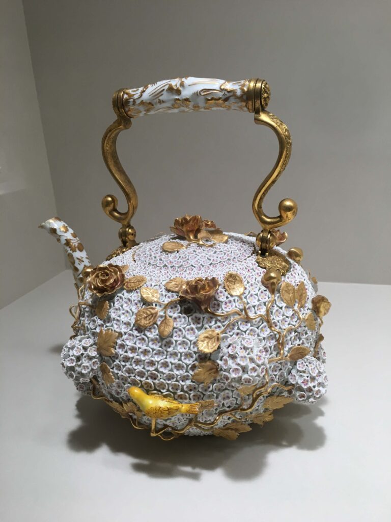 本作は小花で埋め尽くされた上に小花のボンボンがつき、金色のバラと蔦で装飾される。中央に小鳥が憩う華麗で上品なティーポットである。