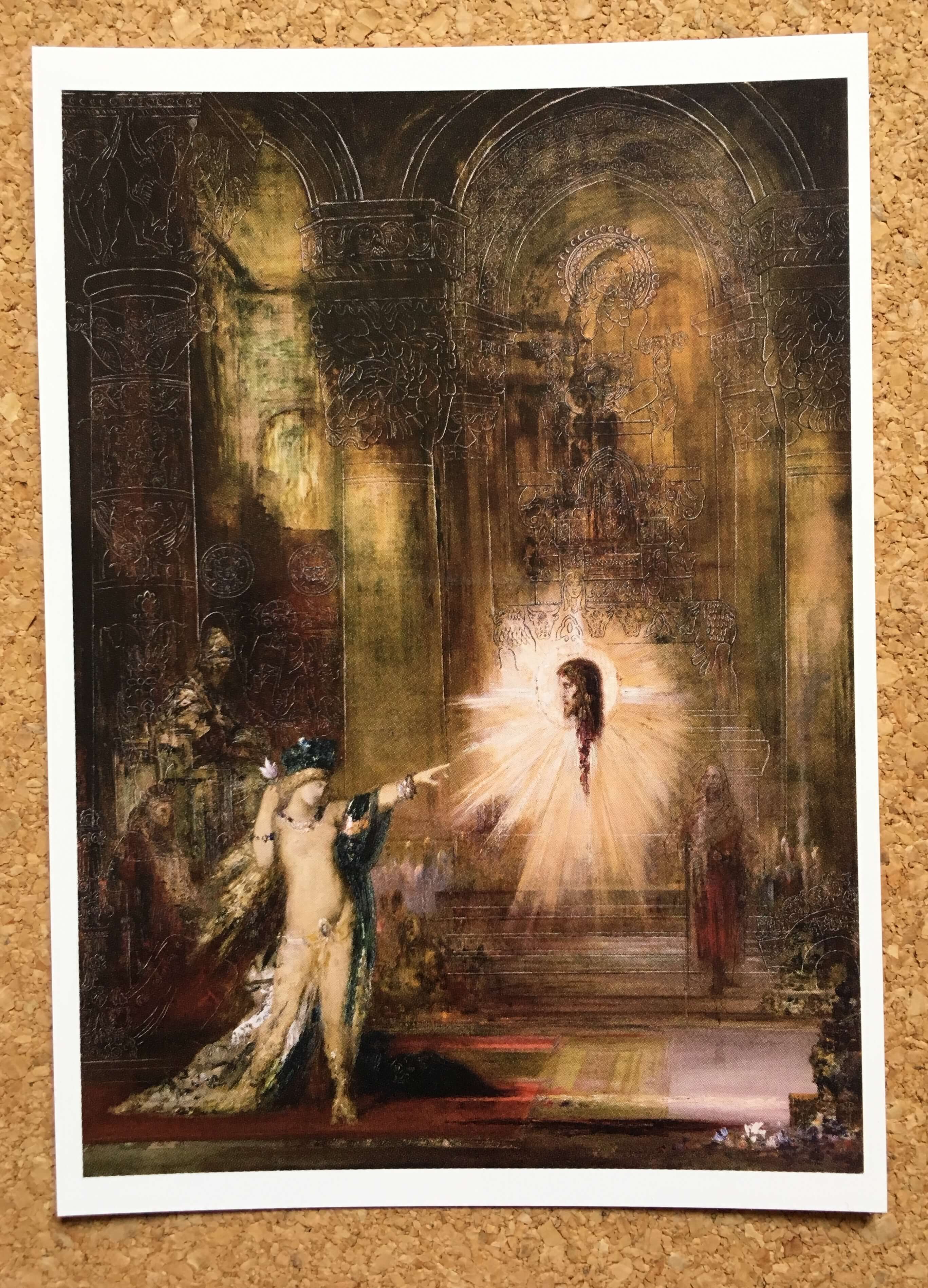 こんなにくっきりはっきりヨハネの首が『出現』しているけれど、これはサロメにしか見えない幻想なんだそうです。その証拠に、背後に描かれている人たちが驚いていない、と。