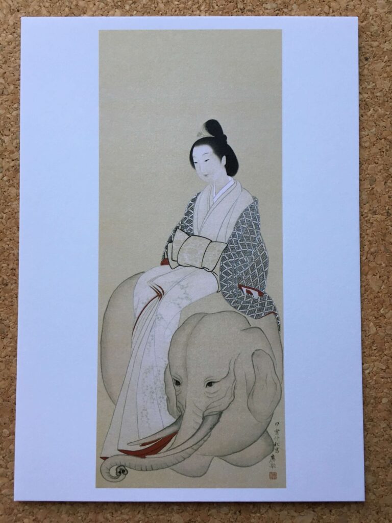 なかなか展示されない作品だそうです。だから、この貴重な機会に、じっくり眺めてまいりました。髪の生え際や、着物の模様の細かさに応挙の性格が表れていそうです。そして、なんと言っても象の鼻の先っぽが正面向いていて、その形の可愛さに思わず笑ってしまいました。